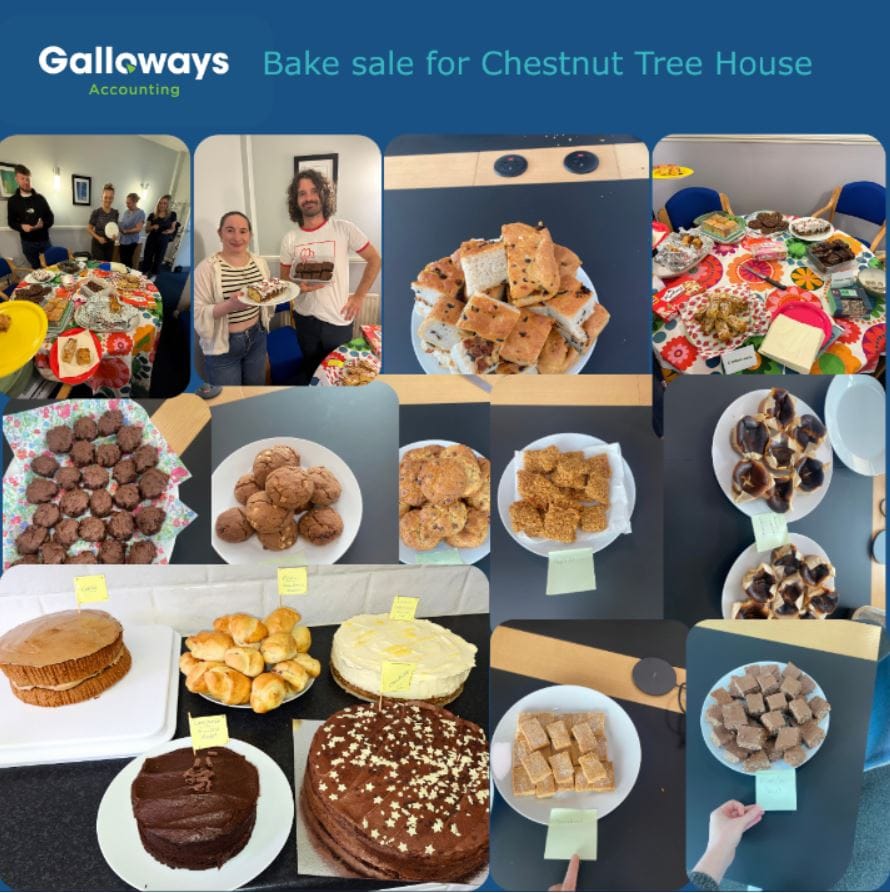 Galloways staff got together last week to organise a bake sale across all offices in aid of Chestnut Tree House. Thanks to all our amazing social organisers and fantastic bakers who brought in this delicious selection of goodies catering for all tastes. We were spoilt for choice! Donations reached almost £1,000 – so thanks also to the cake eaters!